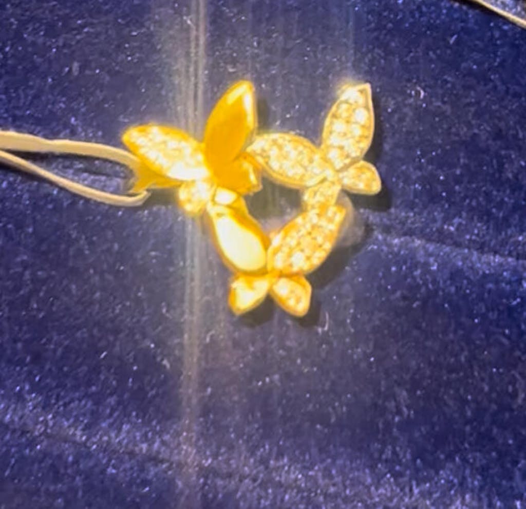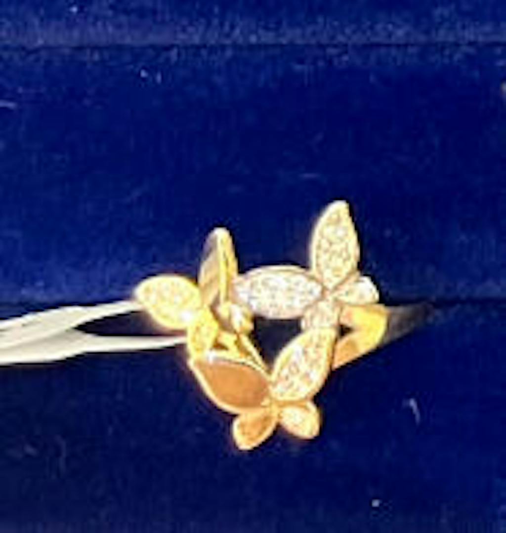 Each butterfly is adorned with brilliant cubic zirconia accents, adding a shimmering touch of elegance. The polished gold band enhances the design’s fluidity, making this ring a captivating statement piece for any occasion.